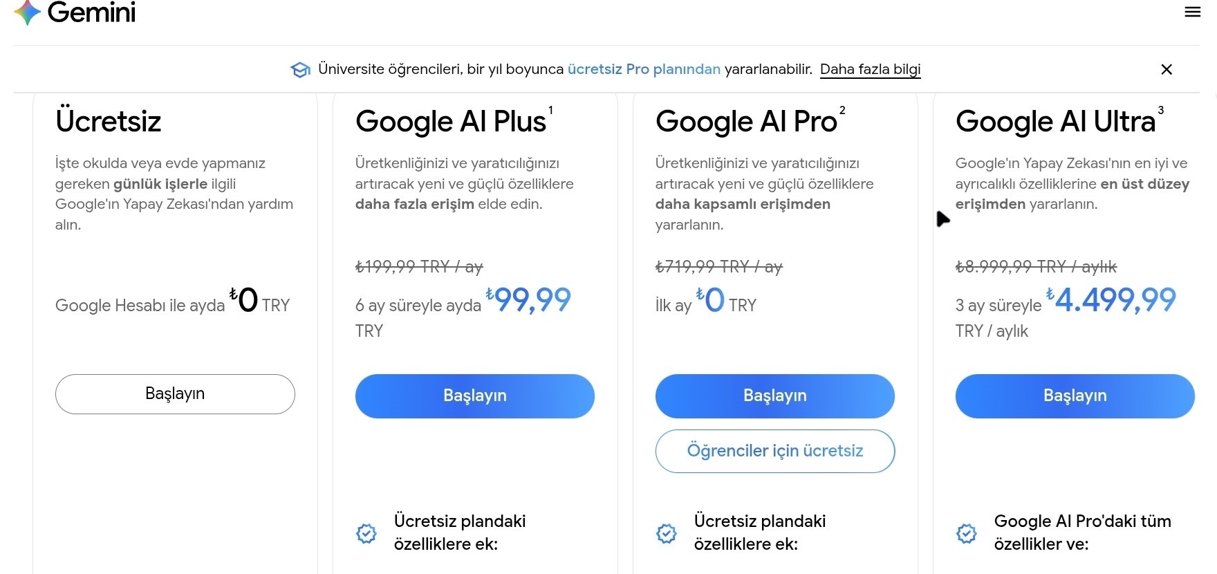 Google Gemini Pro modeli Google AI Pro 2TB depolama planı içerisinde yer alıyor. Bu planda Google Gemini 2.5 Pro ve Google Veo 3 yapay zekâ araçlarına sınırlı erişim sunuluyor ve aylık 720TL fiyata sahip. Bu da 7200TL tasarruf anlamına geliyor.